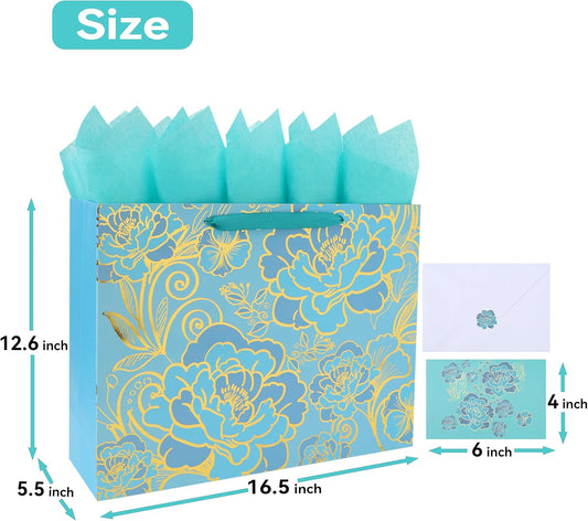 16.5” Extra Large Rose Green Gift Bag Set with Handles, Greeting Card, Tissue Pa