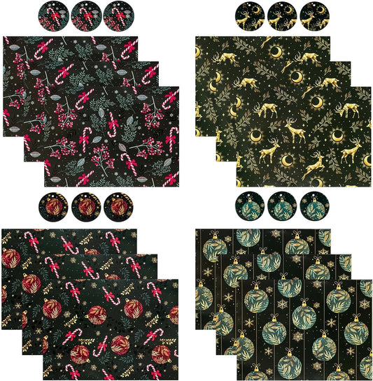 Christmas Wrapping Paper Sheet - 12 Sheets Green Chrismas Ball and Candy Cane Design Folded Flat with 12 Gift Tags for Holiday, Party Celebration - 19.7 Inch X 27.5 Inch per Sheet