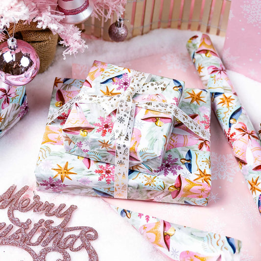 Christmas Reversible Wrapping Paper Roll - Pink Snowflakes and Bells Gift Wrapping Paper for Christmas - 17 Inch X 33 Feet