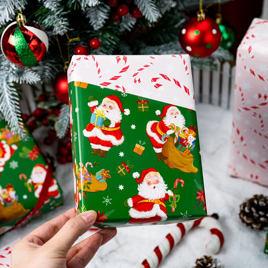 Christmas Wrapping Paper Roll - Green Gift Wrap with Santa Claus, Dahlia, Snowflake, Candy, Christmas Gift Box - Perfect for Christmas - 17 Inch X 33 Feet