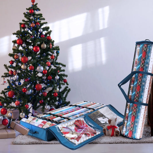 Set of Holiday Christmas Wrapping Paper Storage Box and Wrapping Paper Storage Roll, Gift Wrap Organizer, Blue